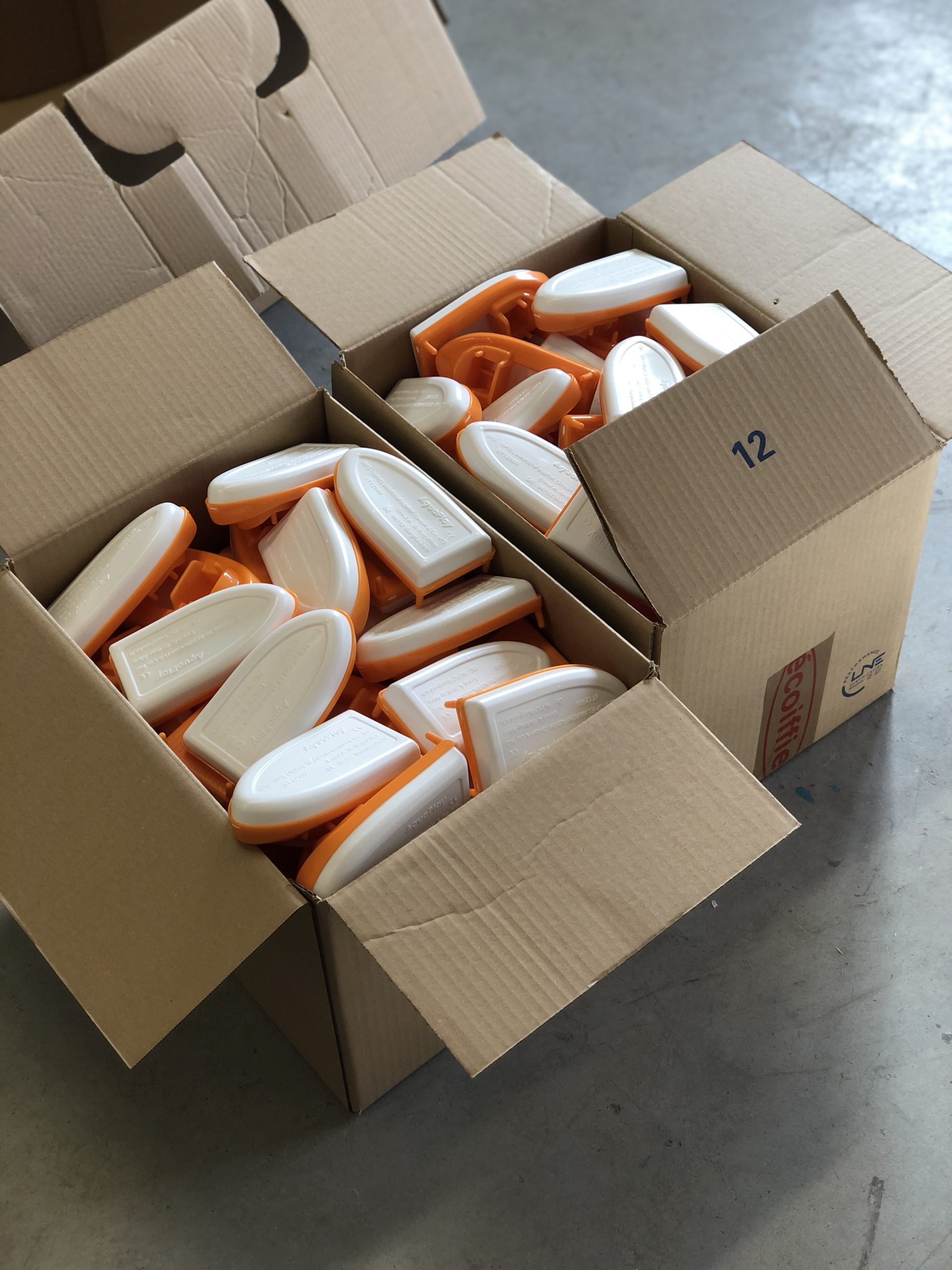 En une semaine, nous avons assemblé 4760 bateaux. Nous avons 378 coques blanches restantes. Nous avons rejeté 121 bases orange pour défaut.