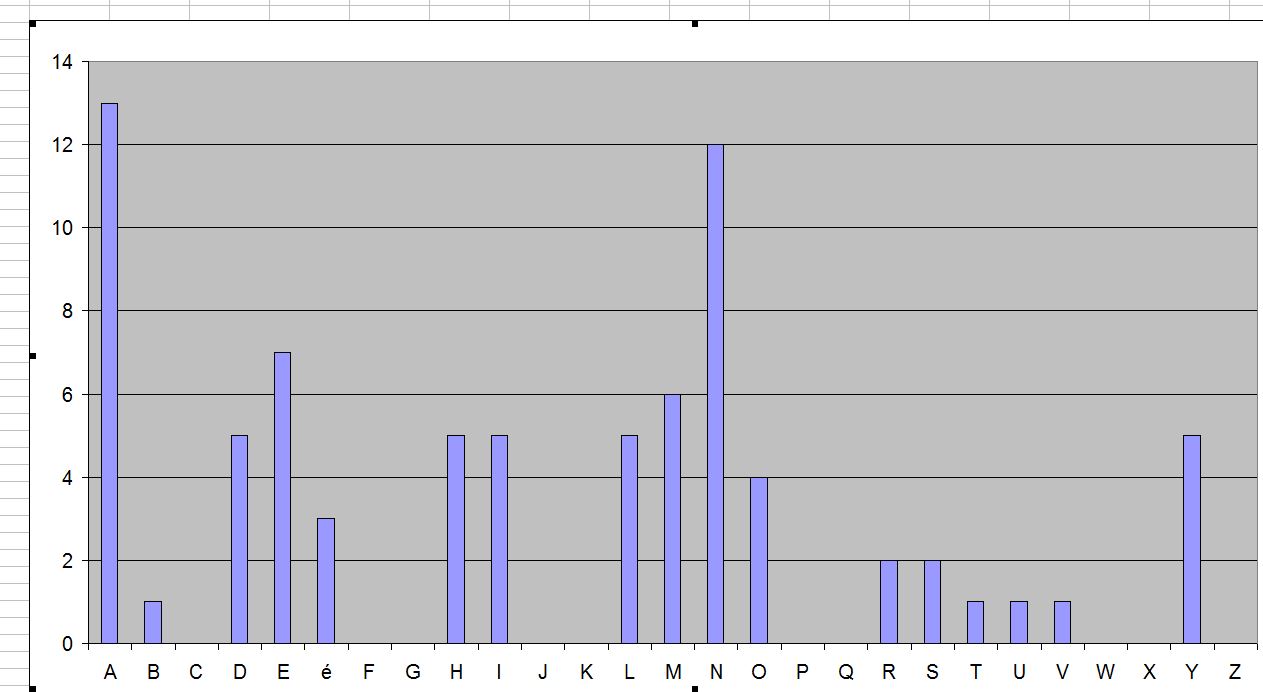 Nous avons ensuite réalisé un histogramme bâton à la main pour observer les fréquences des lettres pour notre classe. Vous trouverez ci-dessous la version numérique de cette histogramme 😉