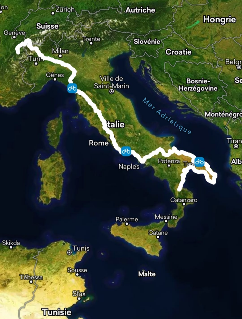 Anthony nous a donné des nouvelles de son voyage. Depuis la semaine dernière, il a continué de bien profiter de la mer et s’est baigné tous les jours (golfe de Tarente). Il est maintenant dans la région de la Calabre (le « pied » de l’Italie). C’est plus montagneux et les montées en vélo sont difficiles! Il se dirige vers le bout du « pied » pour ensuite prendre un bateau pour l’île italienne de la Sicile.