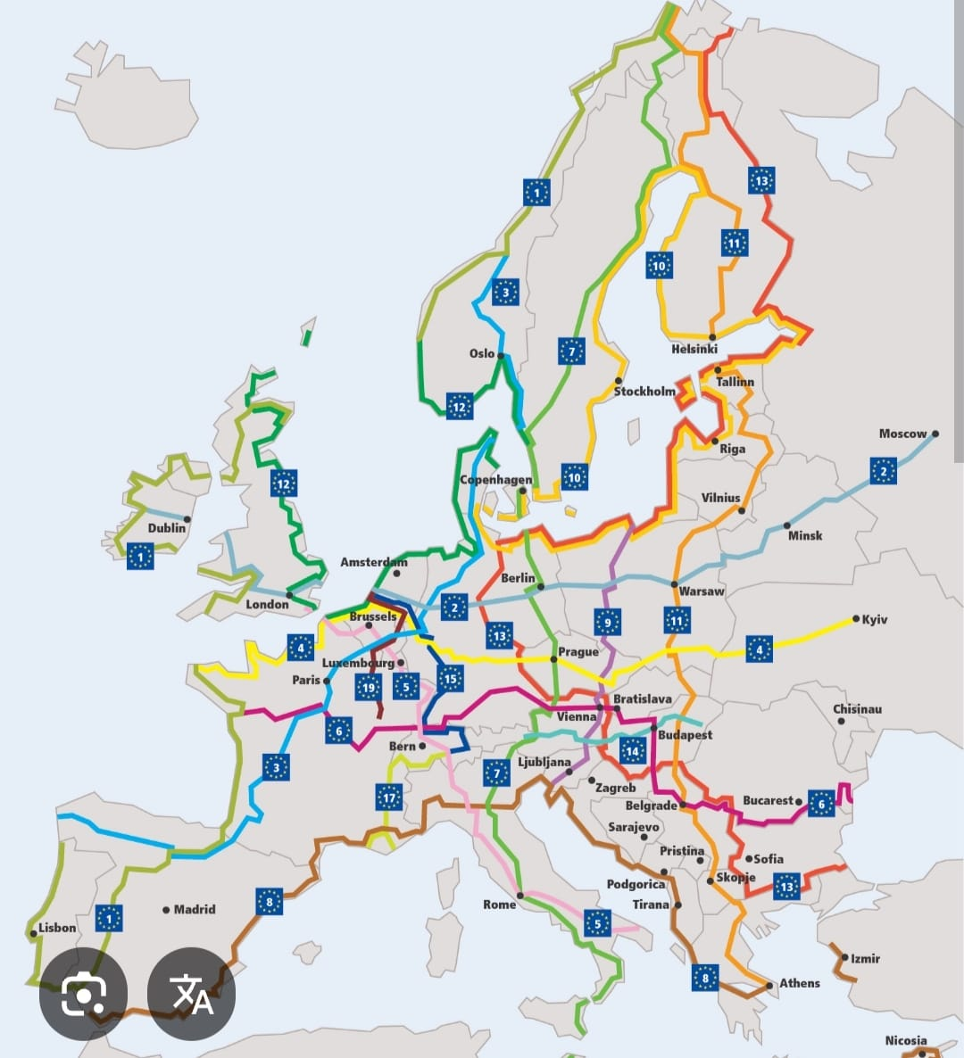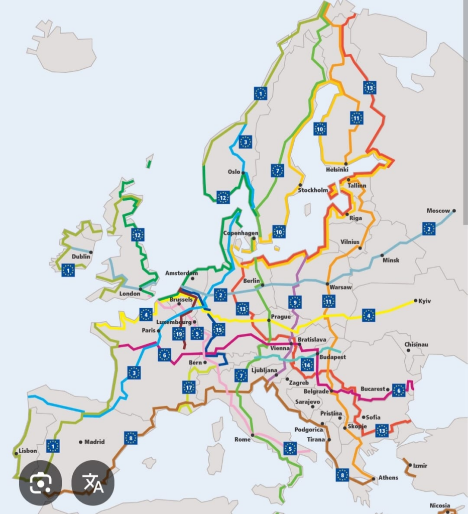 Anthony nous a écrit qu’il avait suivi cette semaine l’Eurovélo 7. Nous nous sommes intéressés à ce panneau qu’il a pris en photo. Les « eurovélos » sont des grands itinéraires de vélo qui traversent l’Europe dans tous les sens! Voici la carte: