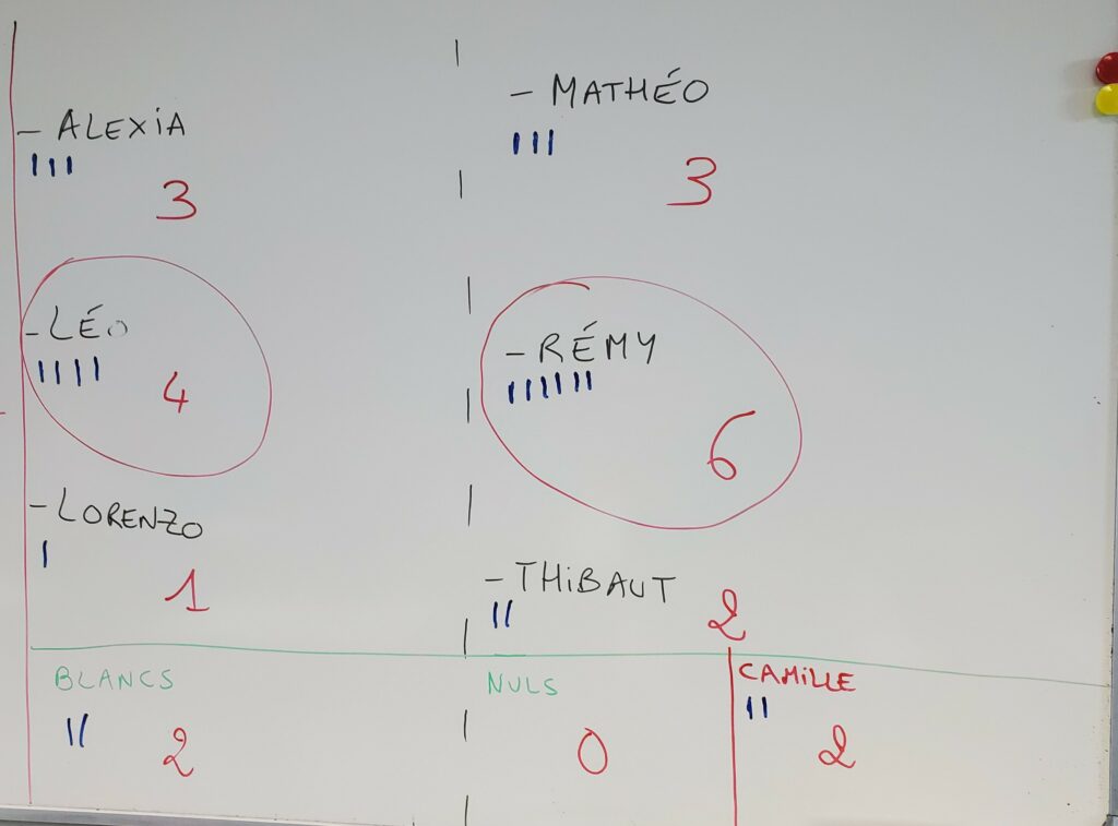 Rémy a donc été élu avec 6 voix. Léo sera le 2e délégué, puisqu’il a reçu 4 voix. Au total, 11 des 12 élèves ont voté (Mathéo étant absent, nous avons placé un bulletin à son nom dans l’urne pour ne pas le pénaliser d’une voix qu’il aurait certainement eue). A noter que Camille, qui ne s’était pas présentée, a tout de même reçu 2 votes !