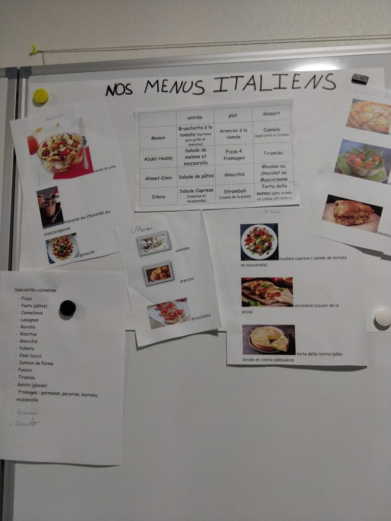 Dans son récit de la semaine, Anthony nous a dit avoir gouté des spécialités siciliennes: les arancini et les cannoli. On vous laisse les découvrir sur Internet! On a donc poursuivi notre travail sur les spécialités italiennes, et voici quelques exemples de menus italiens: