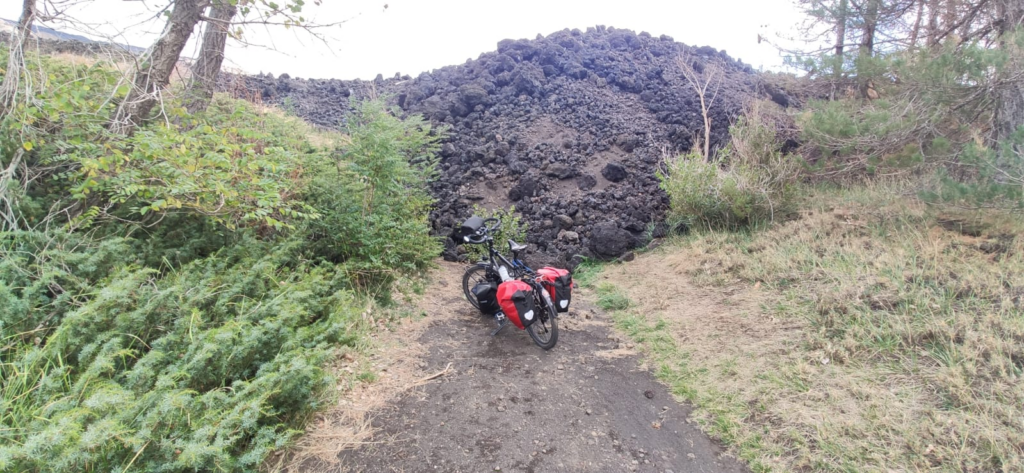 Pour se rapprocher du volcan, il a pris une piste difficile dans l’ambiance particulière de l’Etna! Il a même eu une route coupée par une ancienne coulée de lave!