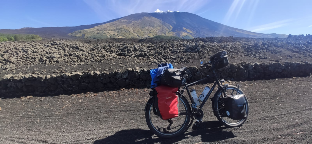 Anthony est en Sicile! Il a traversé avec un bac sur cette île juste après le message de Vél’Italia 3. La Sicile est cette grande île tout au sud de l’Italie. Arrivé en Sicile, il voulait aller en bateau sur les îles éoliennes et surtout aller voir le volcan Stromboli. Mais la mer était vraiment trop agitée et les bateaux ne pouvaient pas naviguer (sécurité). Il a donc repris son vélo pour aller en direction de l’Etna. C’est le plus haut volcan actif d’Europe et l’un des plus actifs du monde avec près de 80 éruptions au cours du XXᵉ siècle!