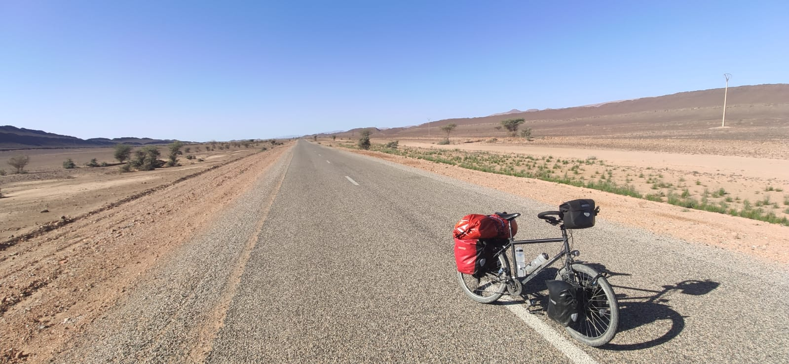 Anthony continue sa route en direction des portes du désert du Sahara. La route qu’il prend est déjà bien désertique, et les lignes droites sont très longues! C’est très calme et silencieux, et il apprécie vraiment cela!