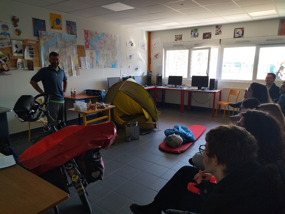 - Dans la salle Dinamo1 : Anthony a présenté ses affaires, son vélo, son matériel de bivouac, et il a pu présenter son voyage et répondre aux nombreuses questions des groupes qui se sont succédés. Les cartes des 4 pays dans lesquels il a roulé étaient affichés dans cette salle.