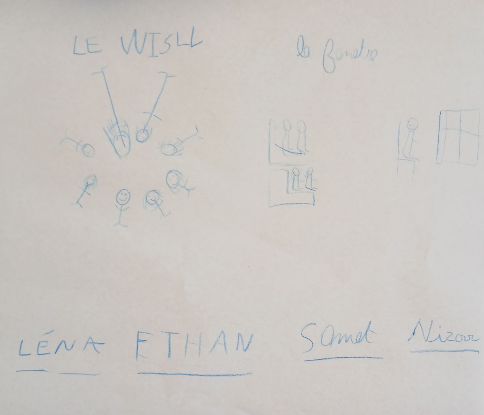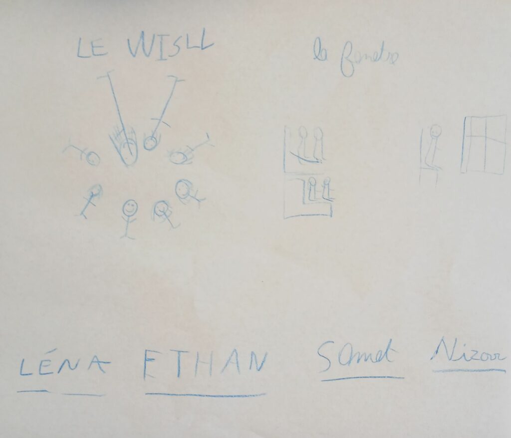 Aujourd’hui, nous avons accueilli Ethan dans le groupe. Nous nous sommes rendus au centre social et avons commencé par l’exercice du wizz. Il s’agit de faire passer un courant électrique entre nous en respectant des consignes spécifiques.