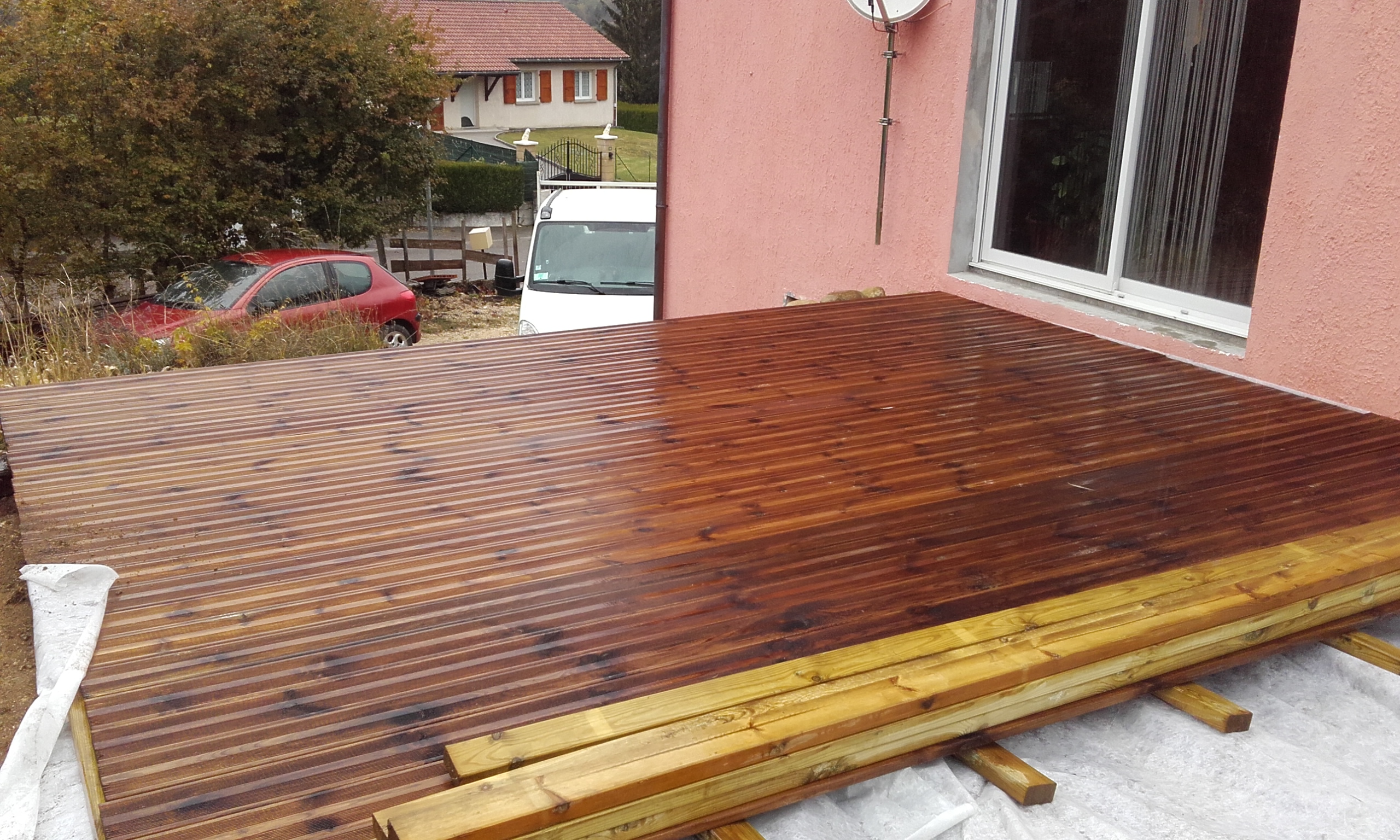 Ensuite, on a mis les planches sur les lambourdes. Puis, on a installé un cordeau pour visser droit et on a commencé à visser les planches de la terrasse.